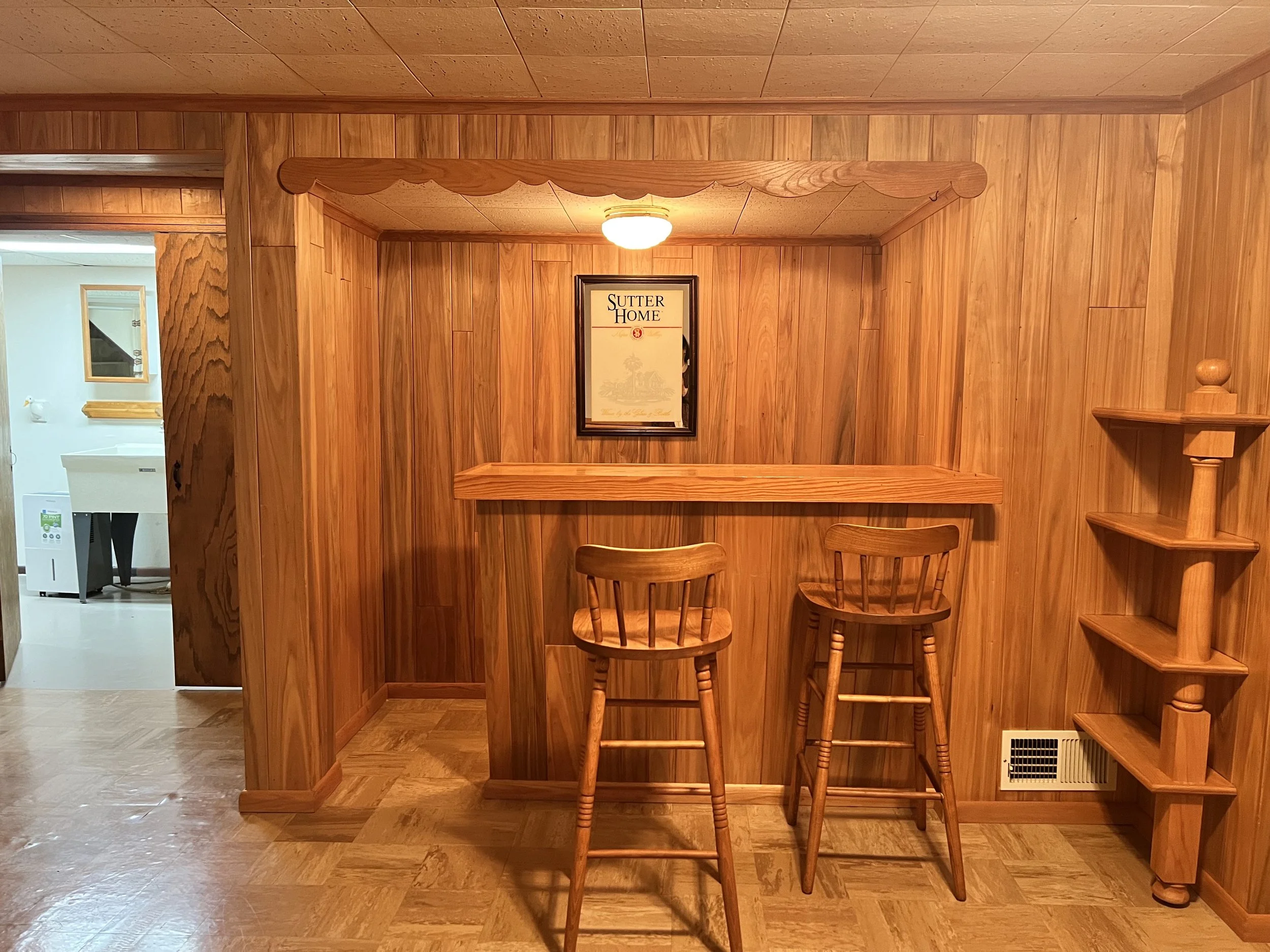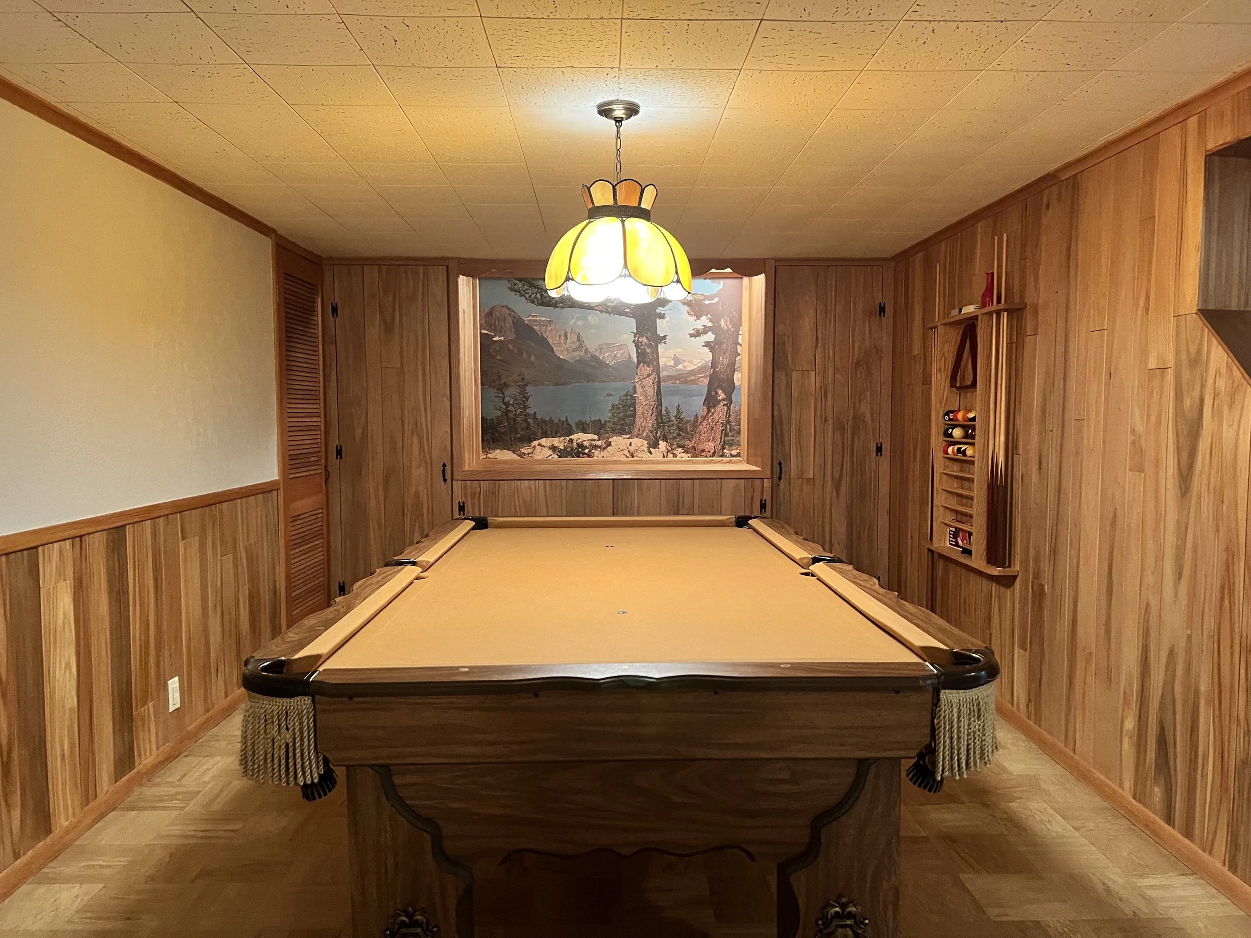 This midcentury basement complete with a basement bar, pool table, and scenic mural