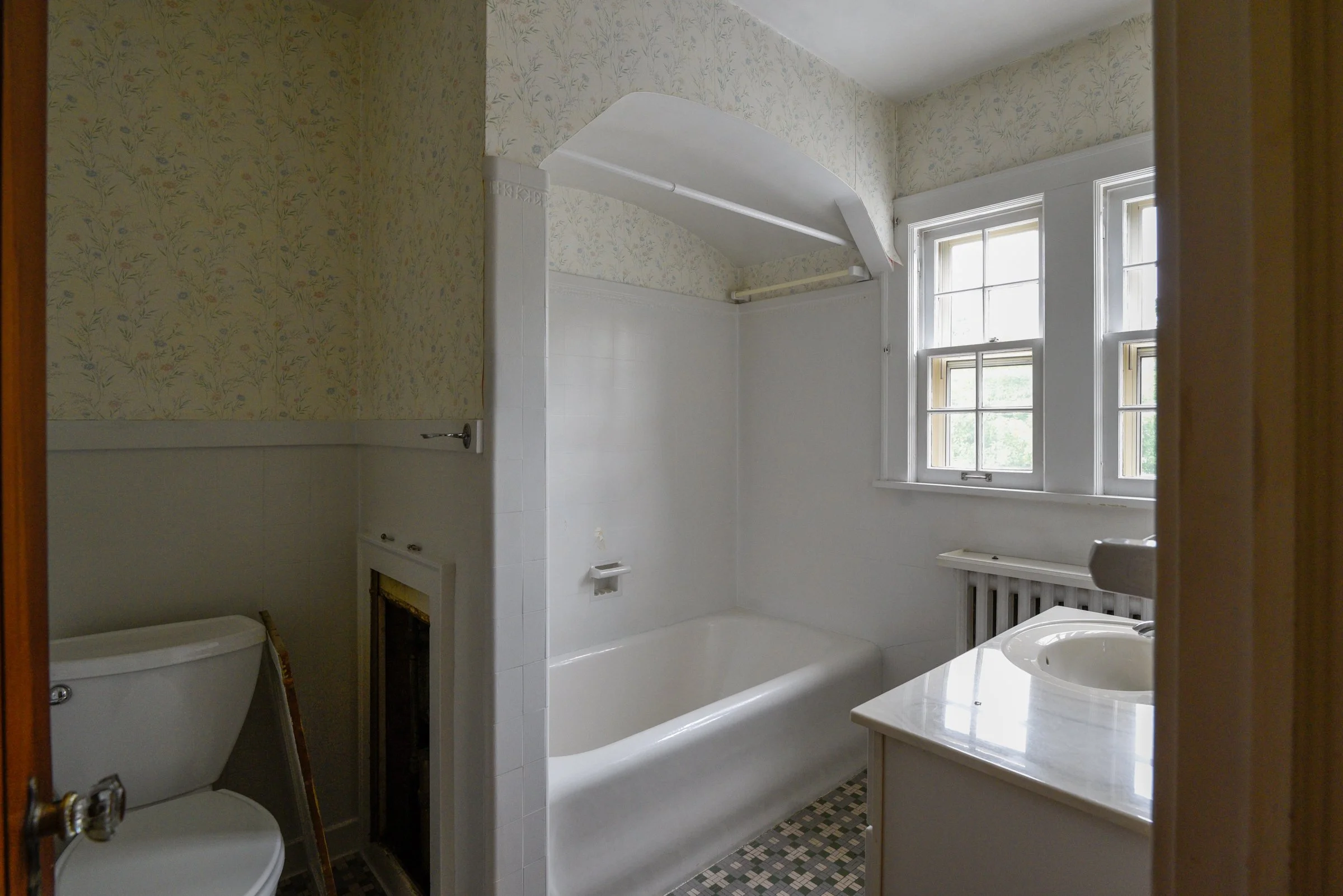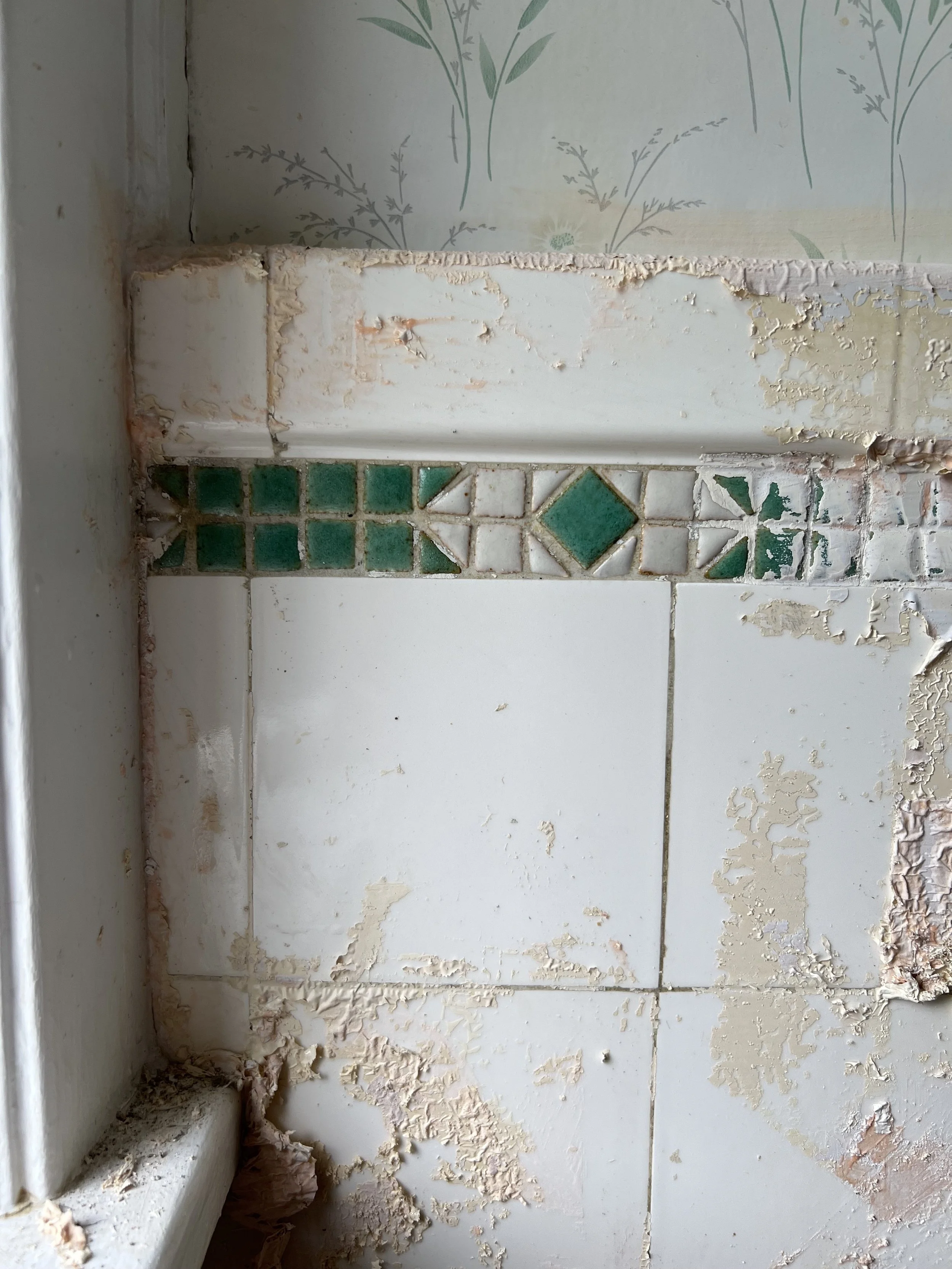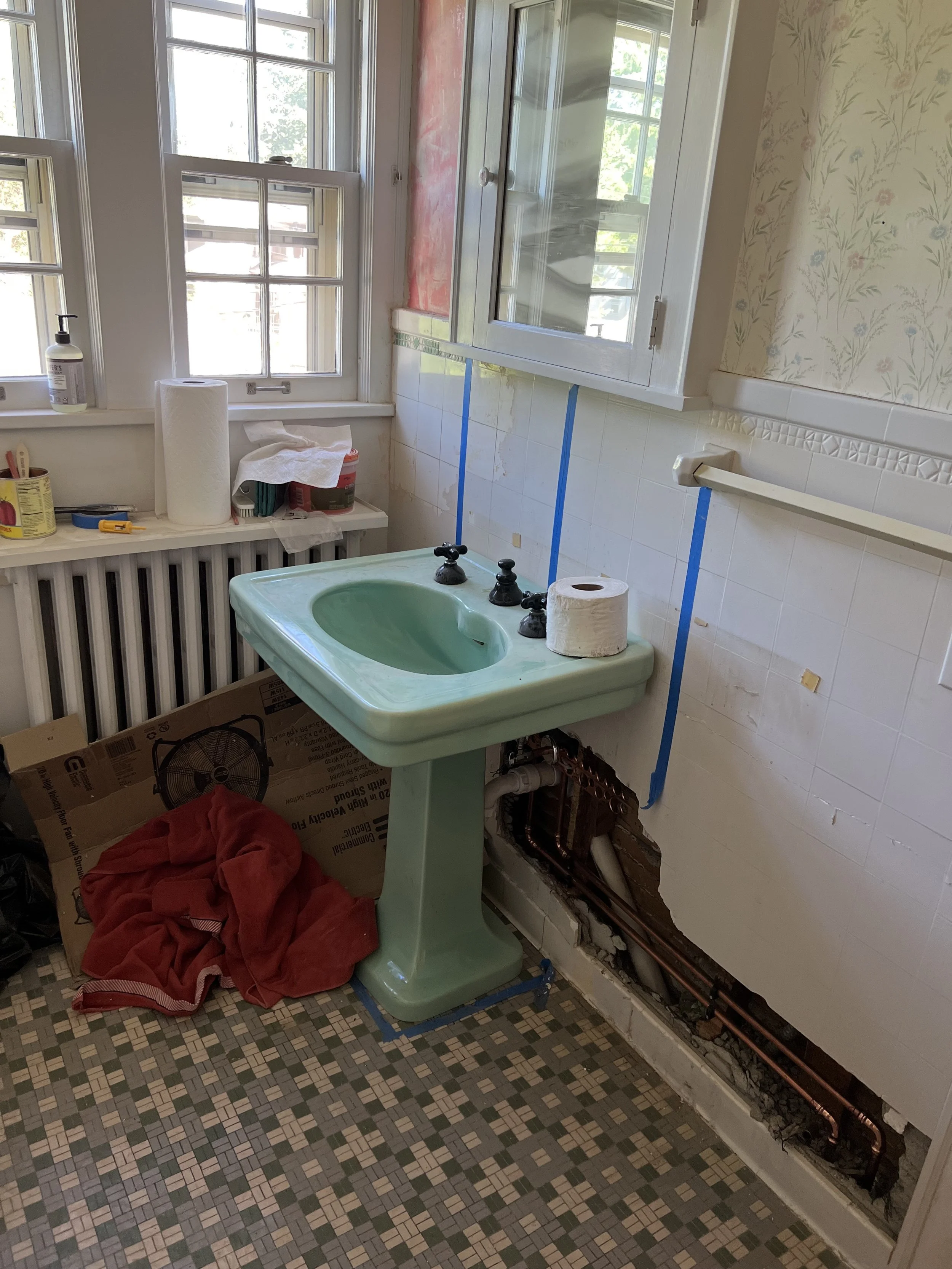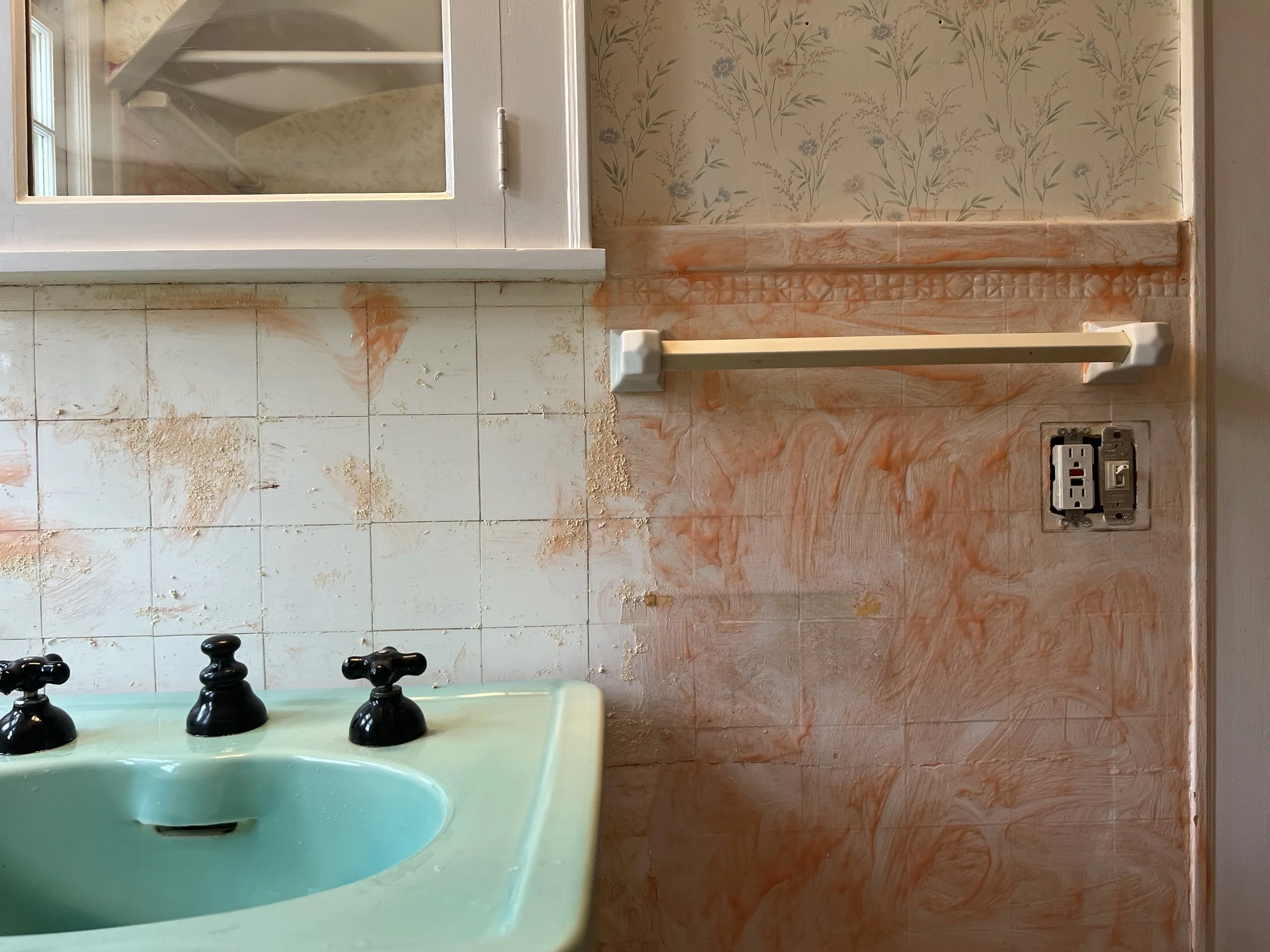 Our bathroom is the most involved remodel we’ve done here - a project that snowballed until we had no choice but to follow through. The galvanized plumbing needed replacement immediately, which was accessed mostly through the kitchen ceiling underneath. Unfortunately, we realized to access the sink plumbing. we’d need to cut into the original tile on the walls as the backside of the wall wasn’t an option. The tile had been painted white at some point, and I was curious what was underneath, hoping that if it were something special we’d find another way to fix the plumbing and keep it in tact. I started stripping the paint and discovered white 4x4s underneath (white tile painted white…) and green liner tiles. The 4x4s had some significant cracks running through them, and as timing goes, I found out I was pregnant after applying some more paint stripper one day. Upon that news, this project was virtually abandoned & we decided to do what we needed to and we’d retile the bathroom eventually.