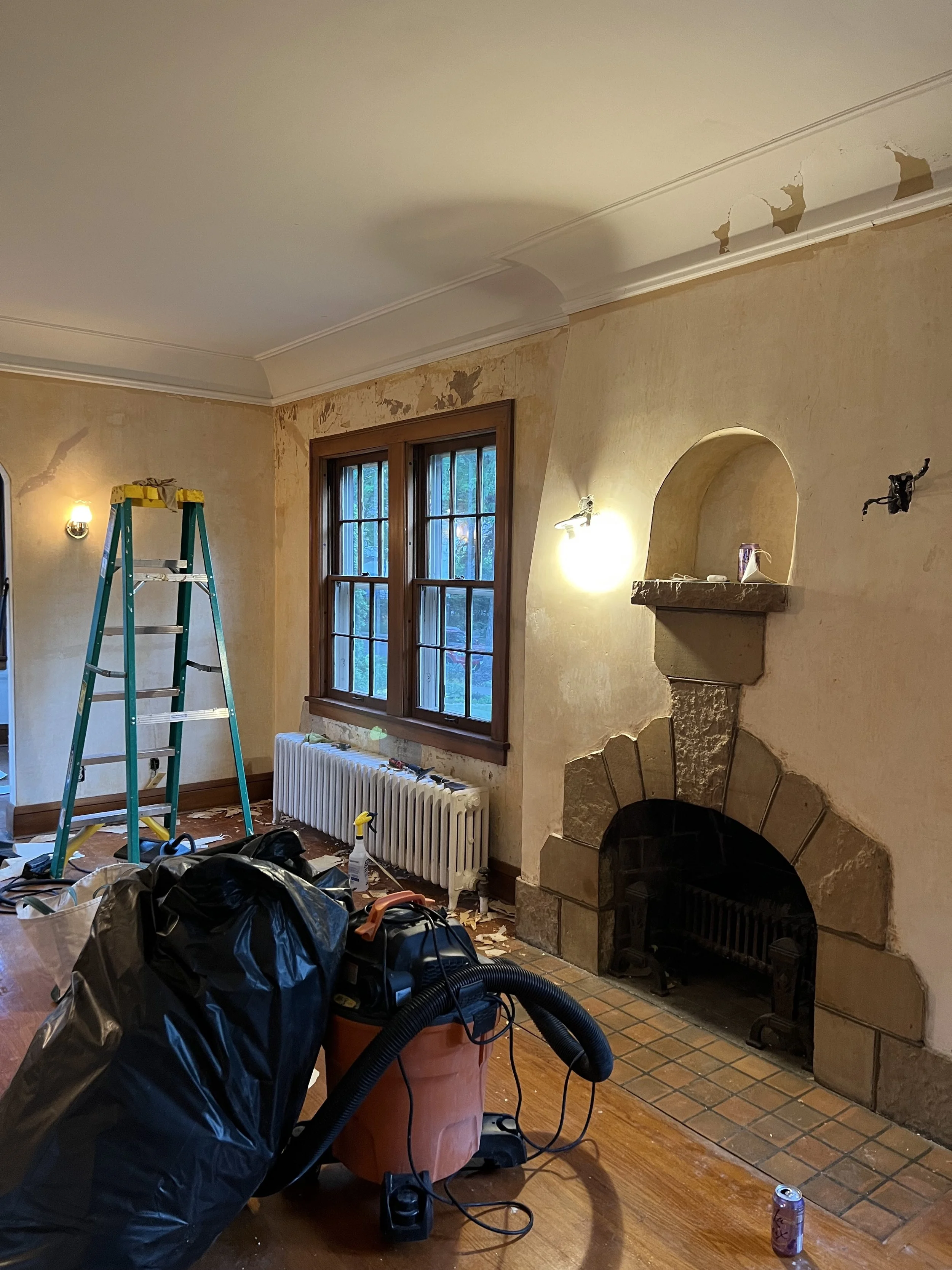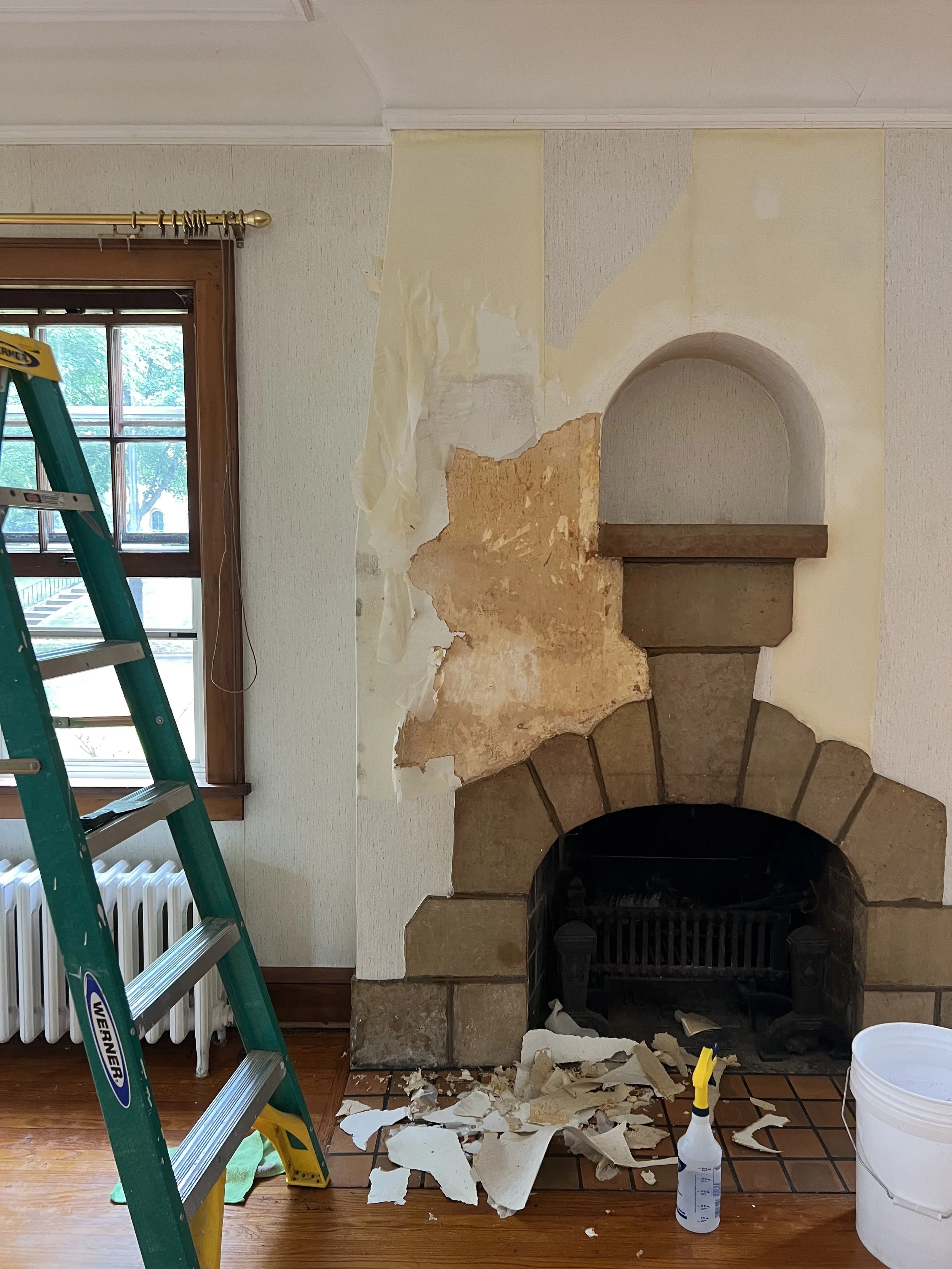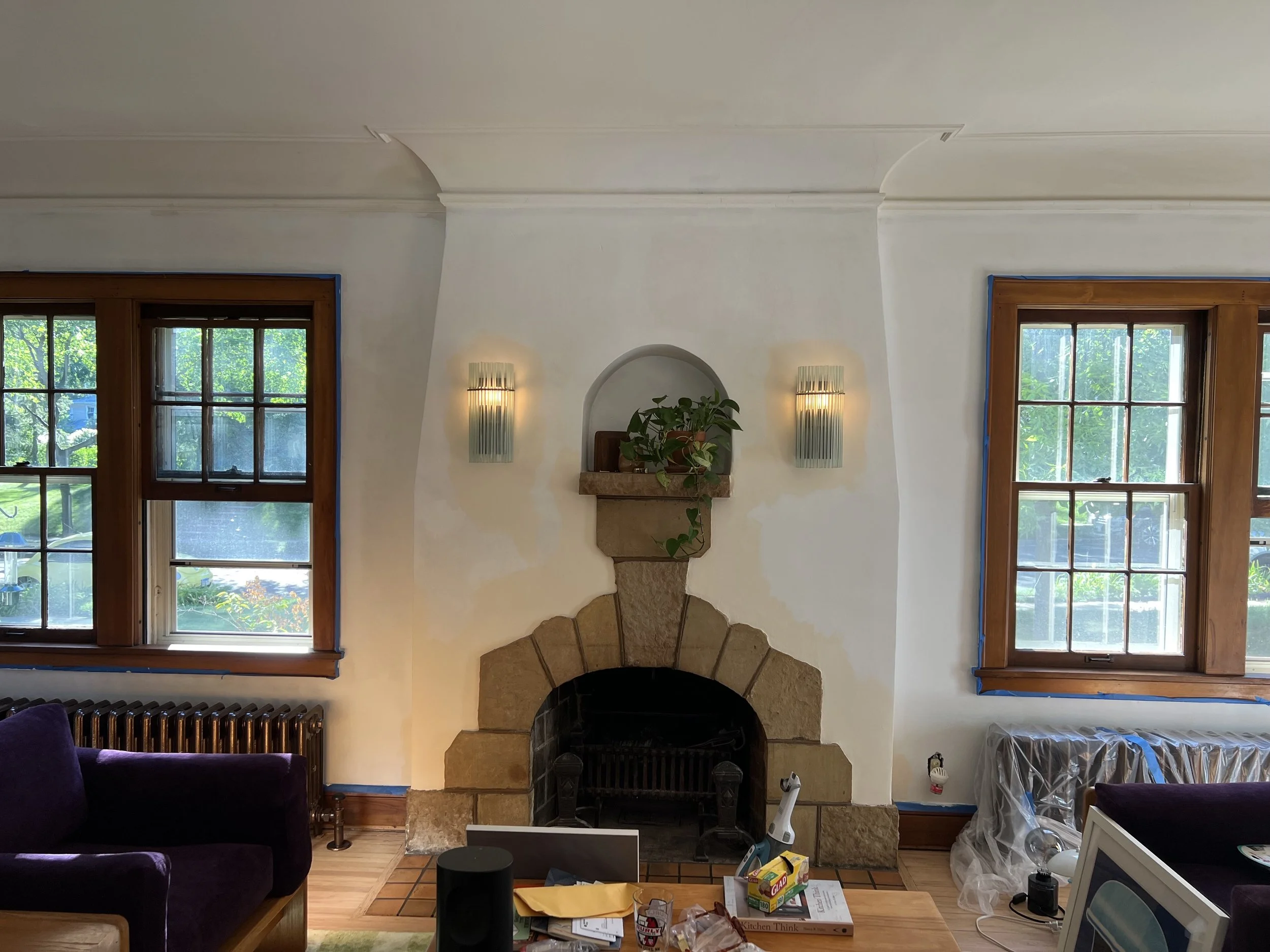 Removing the wallpaper around the fireplace also revealed old sconce boxes that had been filled with joint compound - after pulling that out, we were able to install sconces and the electrical was all in place.