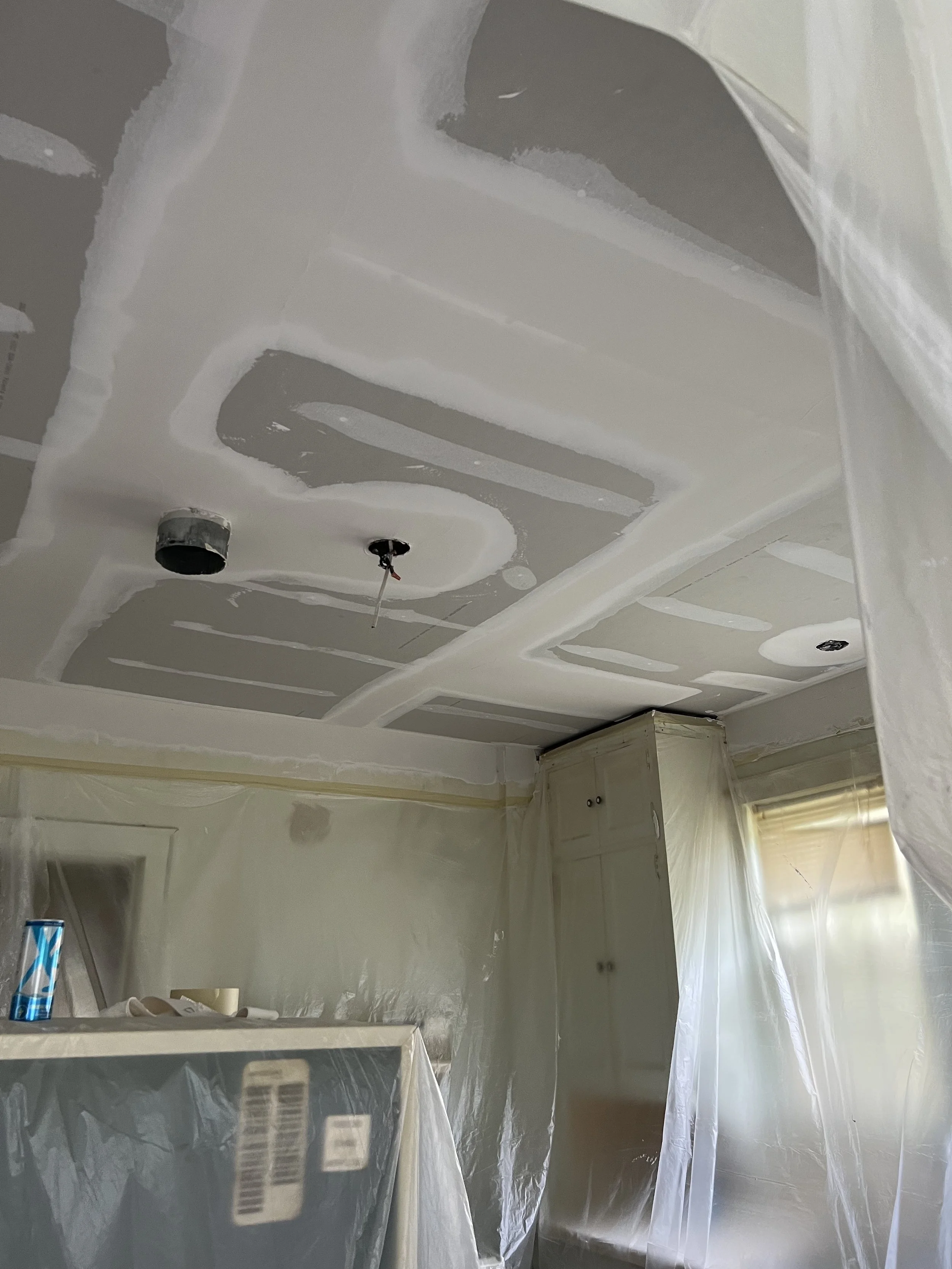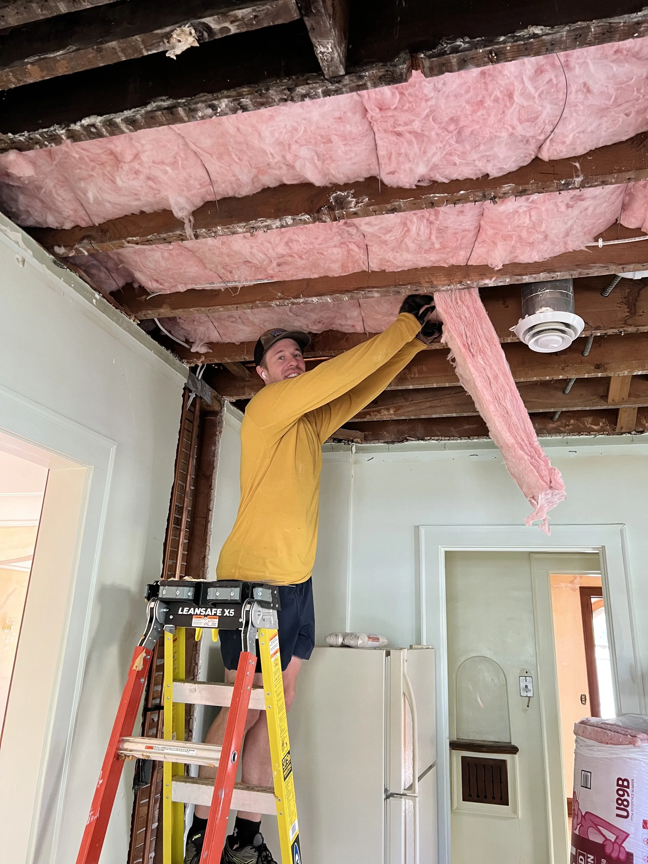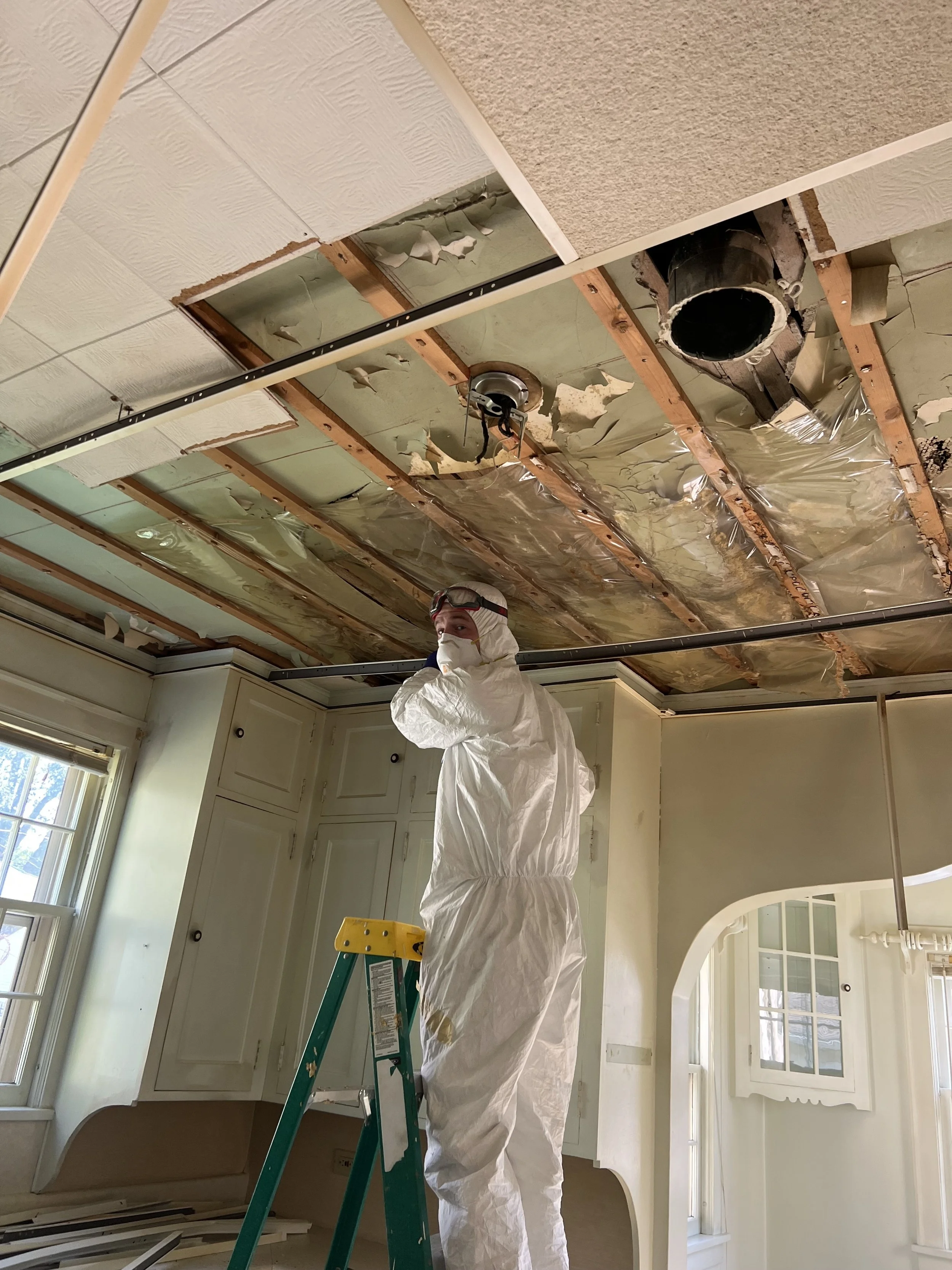 In the journey to access the plumbing in the bathroom, Jack demo’d the ceiling in his “hazmat suit”. The layers were as follows: