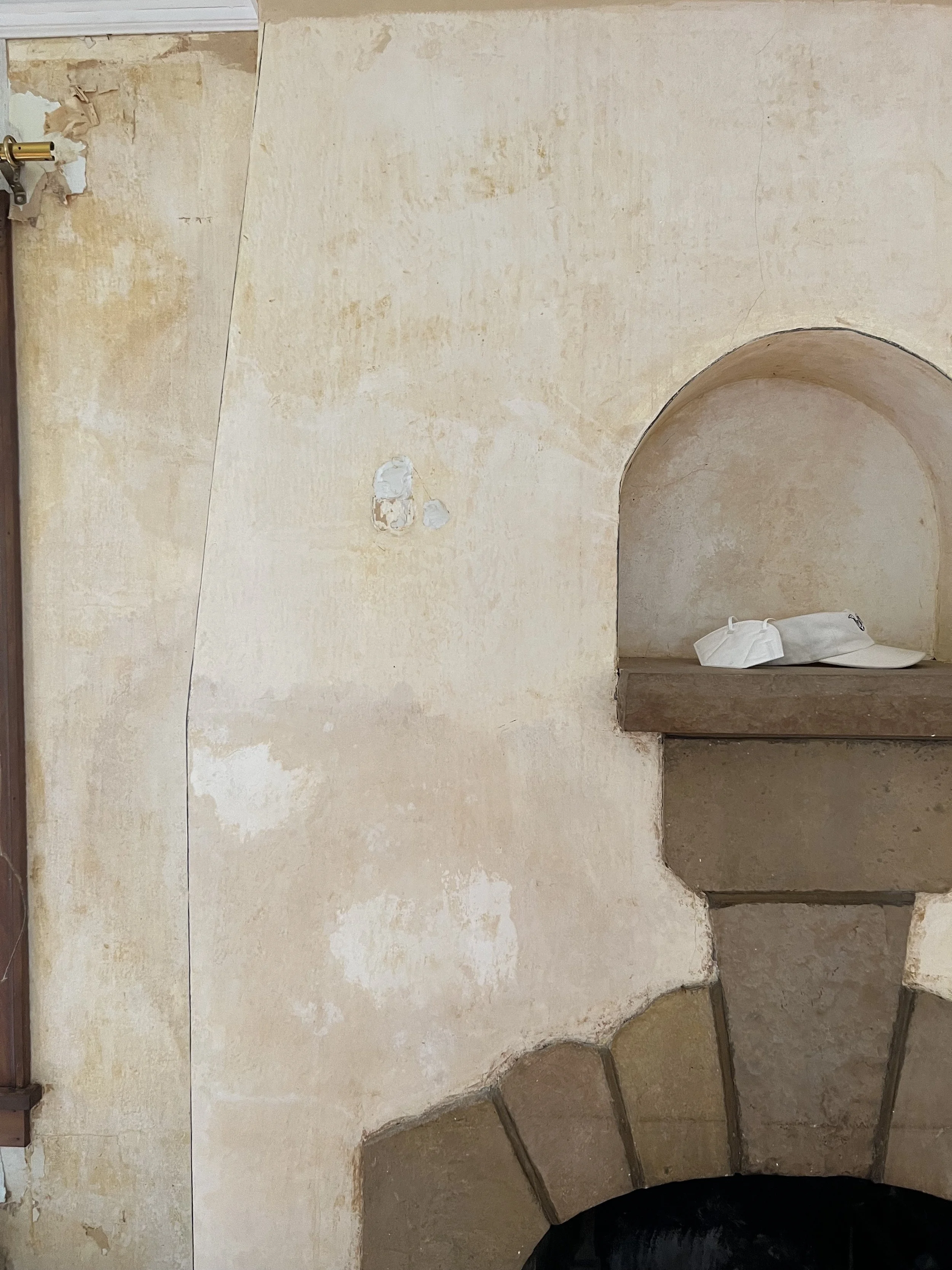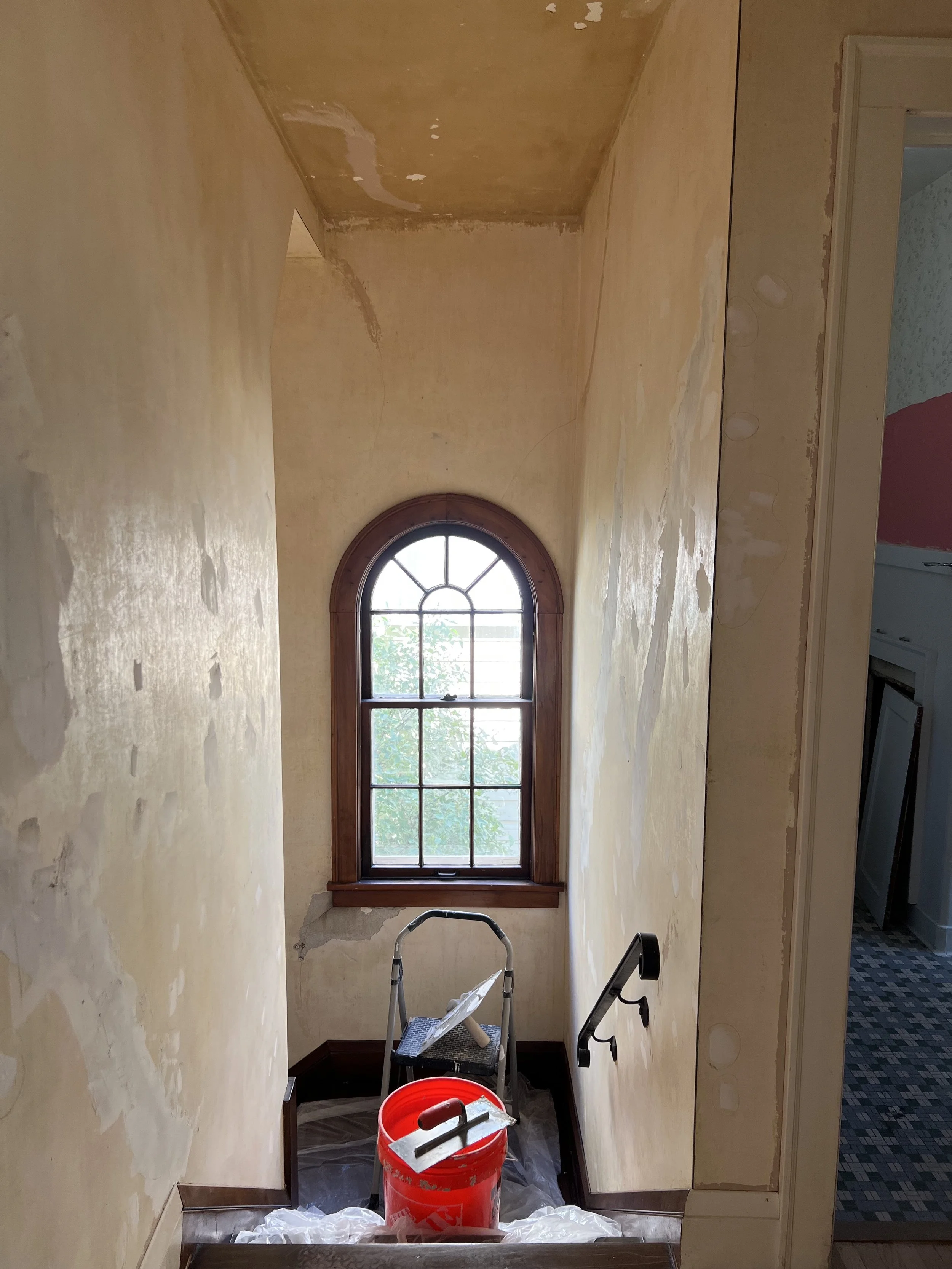 These pictures above show some post-plaster magic WIP joint compound work. The plaster was reattached to the lathe & the joint compound filled in the cracks.