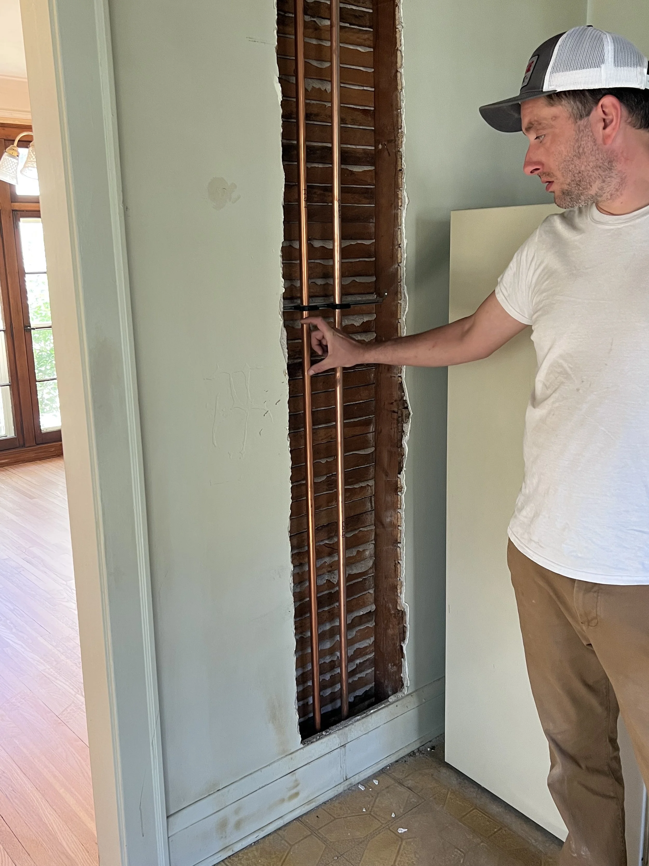 With the ceiling down & joists exposed, our plumber was able to run all new copper up to the bathroom and the water pressure returned.